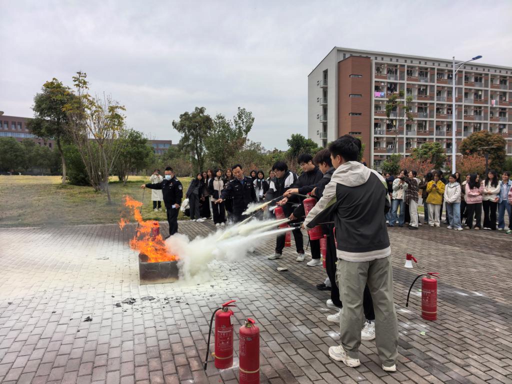活动中,灭火技能培训作为重要环节贯穿始终。在应急疏散演练后和知识讲座期间,均设置了灭火器实操培训。彭广峰老师现场演示了干粉灭火器、二氧化碳灭火器的正确使用方法,同学们分批进行实操演练,亲身体验灭火过程。这种讲练结合的模式使师生真正掌握了扑救初起火灾的技能。
