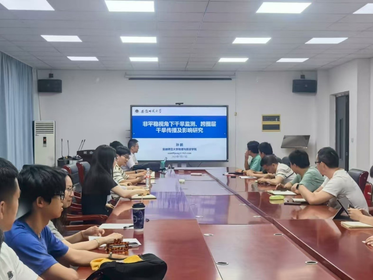 邀请,安徽省“领军人才”特聘教授、安徽省优秀青年基金获得者、安徽省优秀青年研究生导师,安徽师范大学孙鹏教授莅临我校,在求本楼北503会议室作题为《非平稳视角下干旱监测、传播及影响研究》的学术报告。报告会由学院副院长王世航主持,学院部分青年教师、研究生20余人聆听了报告。